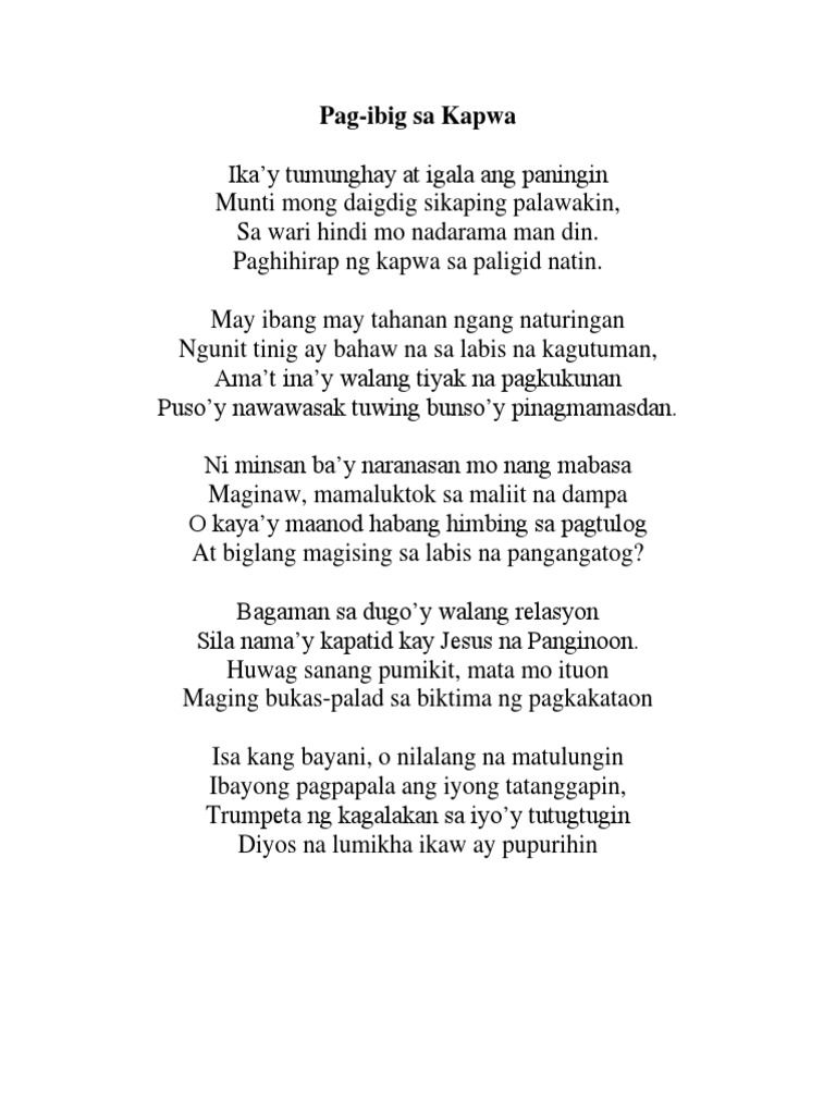 Ilang saknong meron ang tula ang aking pag ibig. Binubuo ito ng koleksyon ng dalawa o higit pang mga guhit ng salita o linya ng mga salita. Gawing gabay ang tekstong aking pinabasa sa inyo tungkol sa mga elemneto ng tula a. Sa dilaw mong dahong ngayon ay kupas na.